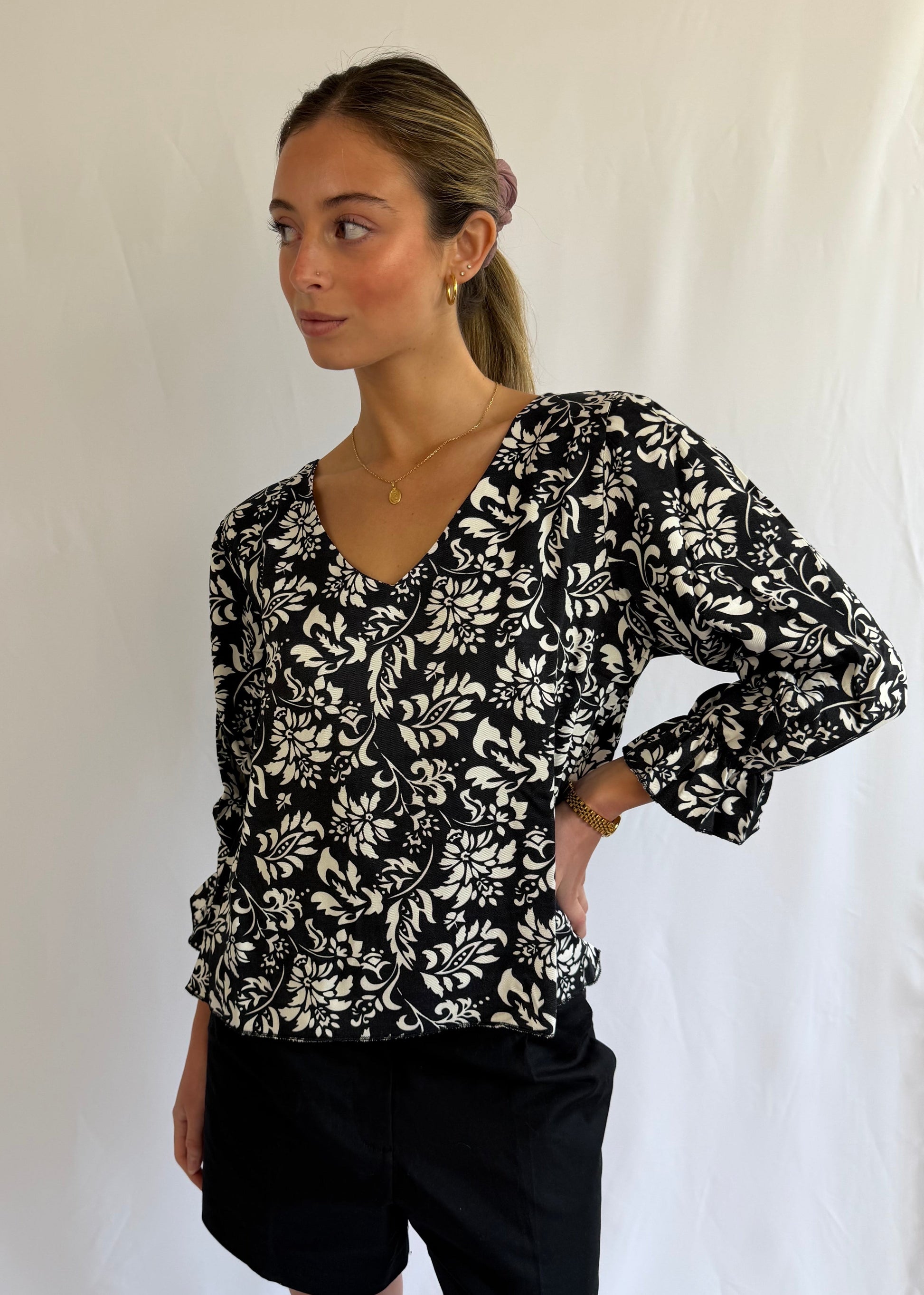 - Blusa manga 3/4 con elastico y escote en V.